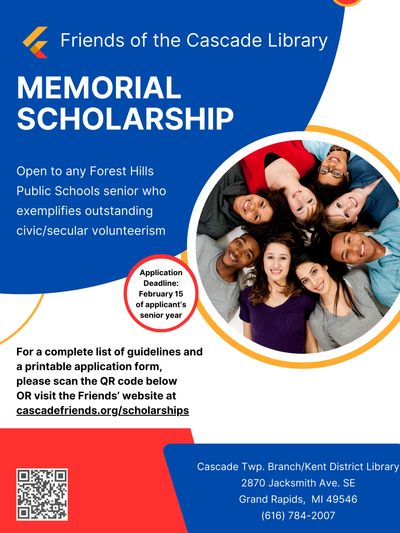 If you know a graduating senior who attends Forest Hills Public Schools (FHPS) and is interested in continuing their education beyond high school, consider telling them about the Friends of the Cascade Library Memorial Scholarship.